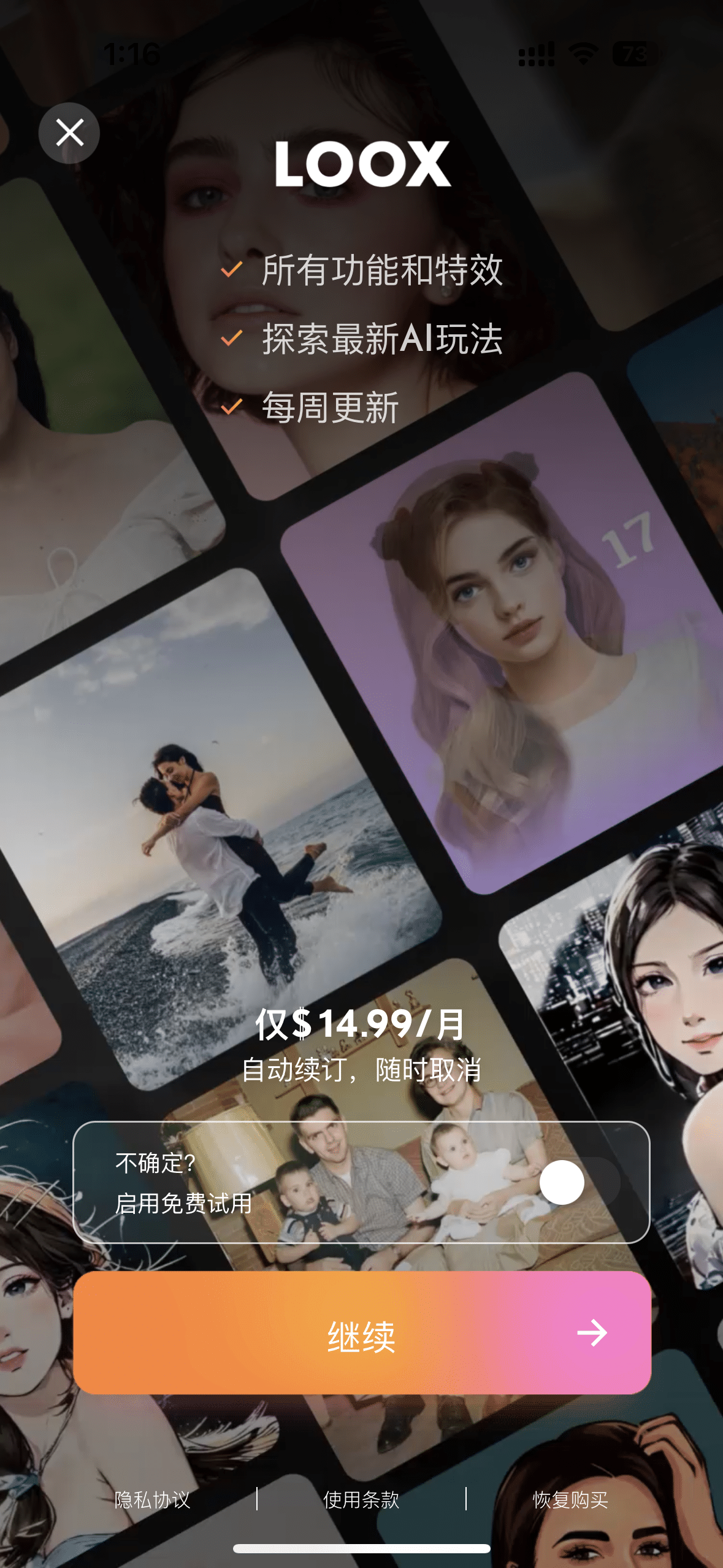 LOOX 是一款集智能绘画,卡通头像,美妆美发,炫酷 3D 动效等多种功能于一体的基于 AI 生成式能力的先进的修图神器。LOOX 可以帮助用户对其形象进行检测,并推荐最适合的妆容、搭配,及发型,其中 AI 换发型功能支持 80+种不同风格的发型,适合不同性别、肤色的人群。此外,LOOX 还能利用 AI 将你的照片转换成不同的风格,日漫、迪士尼、像素…等,并制作成头像、视频、写真,帮你打破次元壁,发现别样的自己。