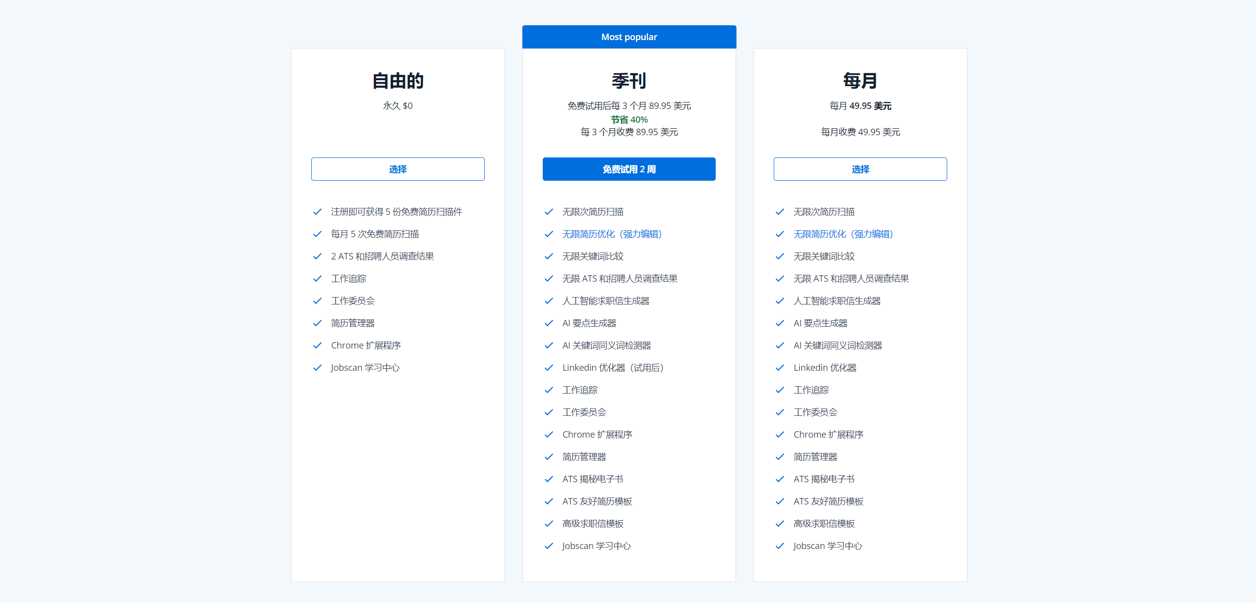 Jobscan 是一款在线 AI 简历生成器。Jobscan 可以扫描旧简历,并基于用户的个人信息,利用 AI 大模型生成适合申请人跟踪系统 ATS(Apply Tracking System)的个人简历,Jobscan 提供大量风格简洁的简历模板,可适配多种文档编辑器,例如 Microsoft word 和 Google Docs,用户可以使用它的生成功能为自己的简历生成表达清晰、重点突出、语言凝练的极具吸引力的个人简介以及技能介绍,编辑好完整的简历后,Jobscan 会对该简历进行评分,并给出优化报告,帮助用户进一步优化其简历以提升应聘成功的机会。