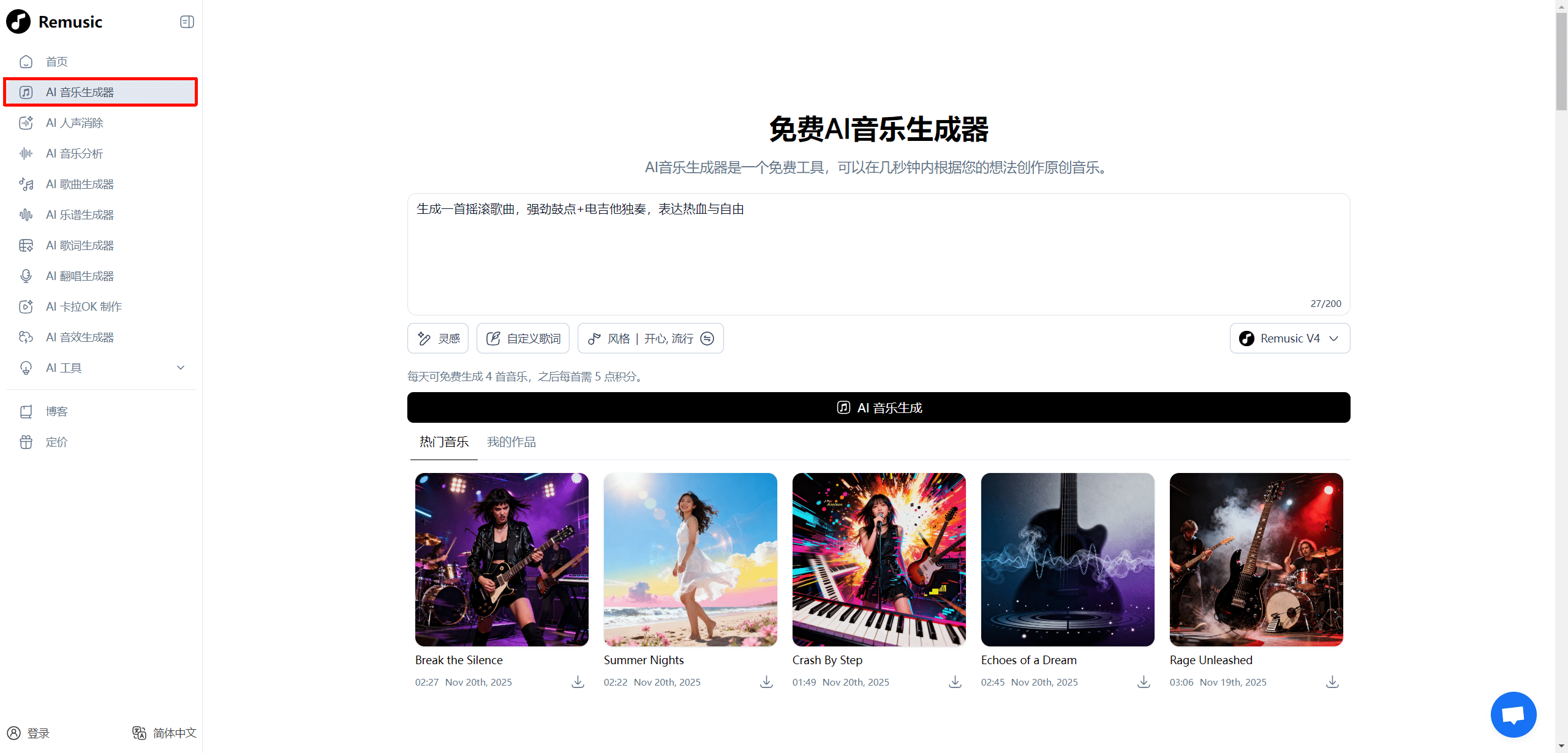 1、进入官网后点击左上角 AI 音乐生成器,输入附带对歌曲的主题、风格、乐器等说明的提示词。