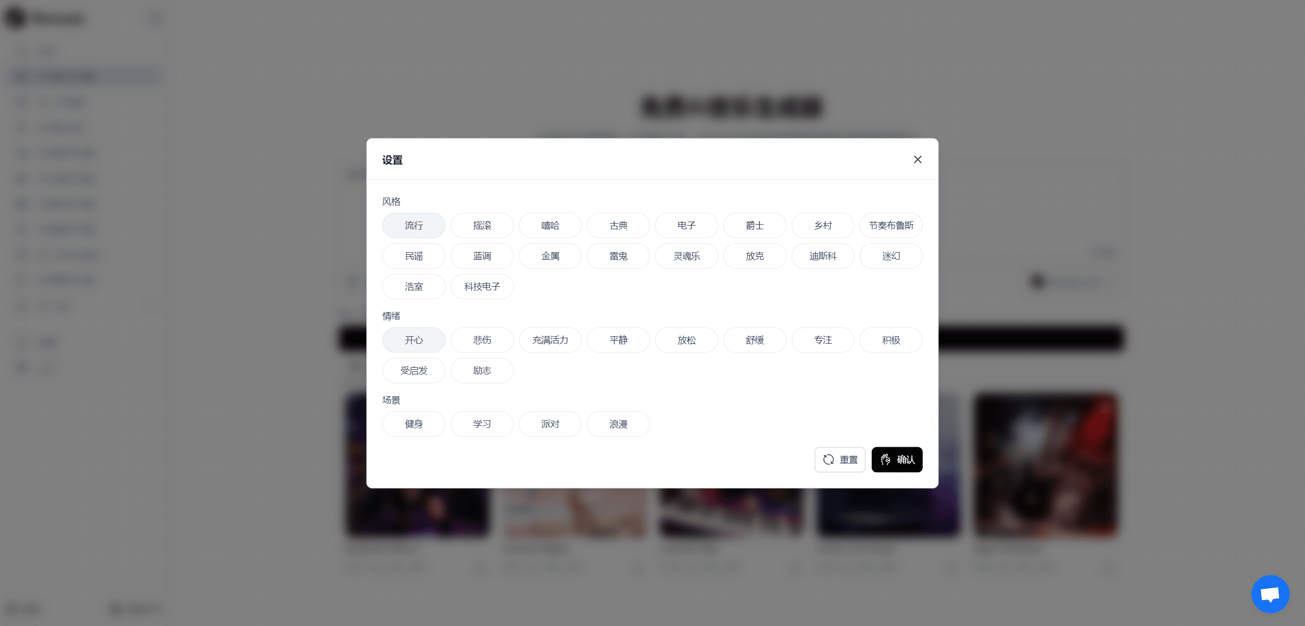 2、点击输入框下方的风格按钮,可以进一步选择歌曲风格,让生成结果更加可控。