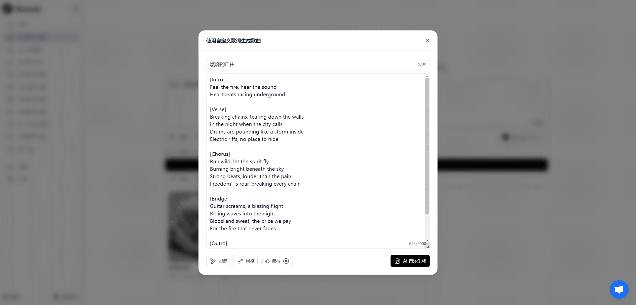 - AI 音乐生成:依靠对歌曲的风格、主题描述即可快速生成完整歌曲,可自定义歌词亦可使用歌词生成器。